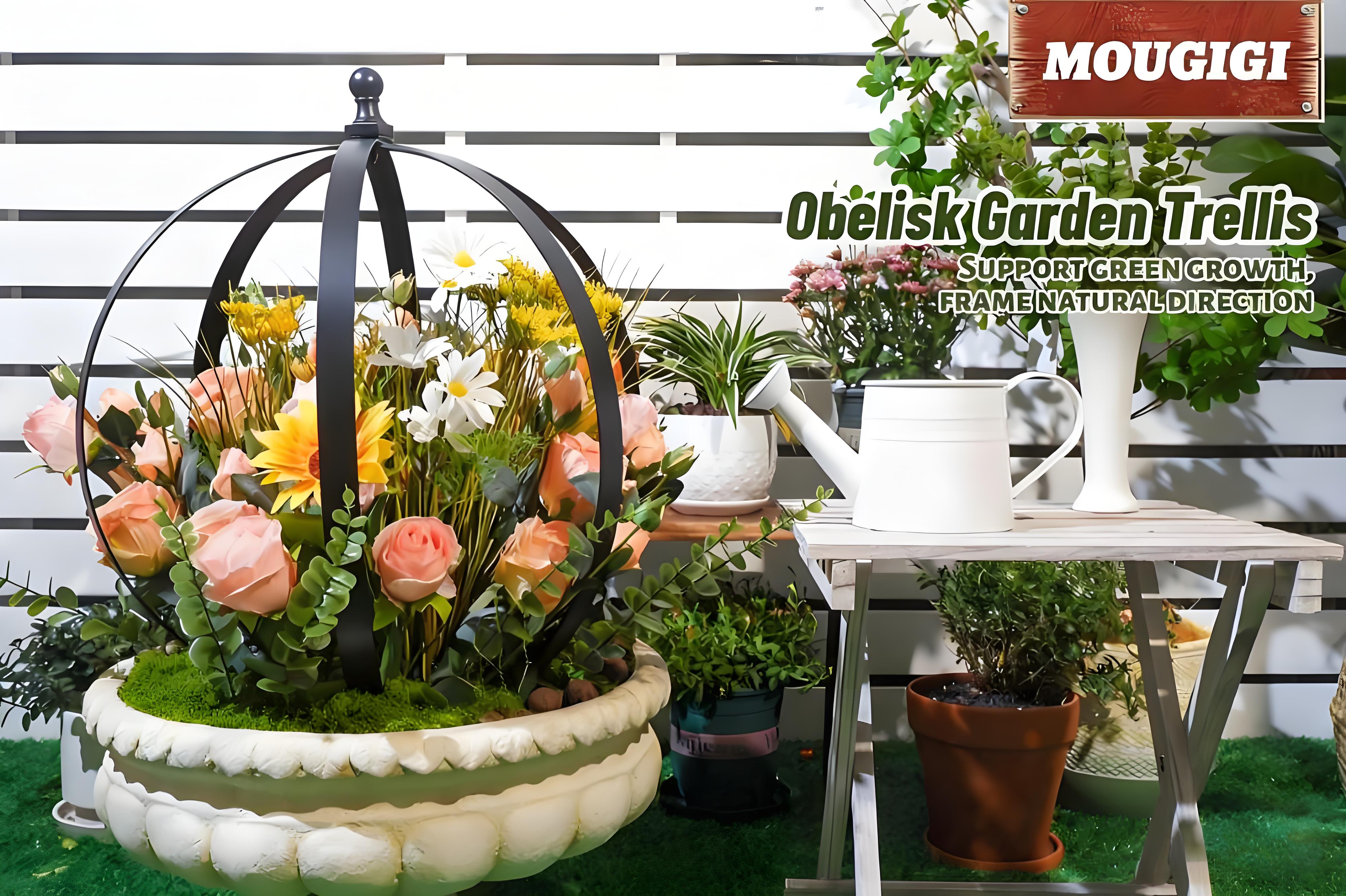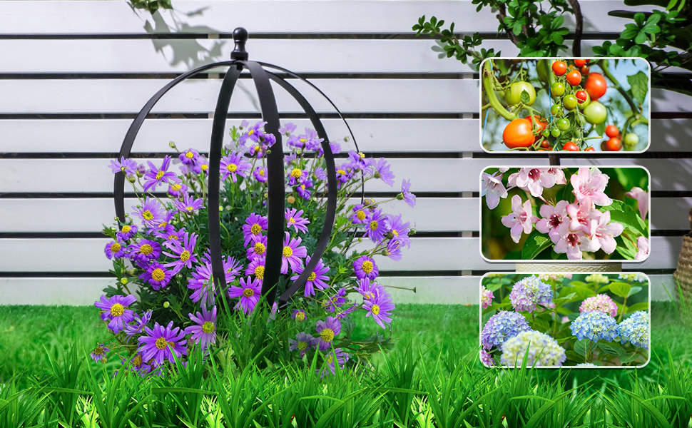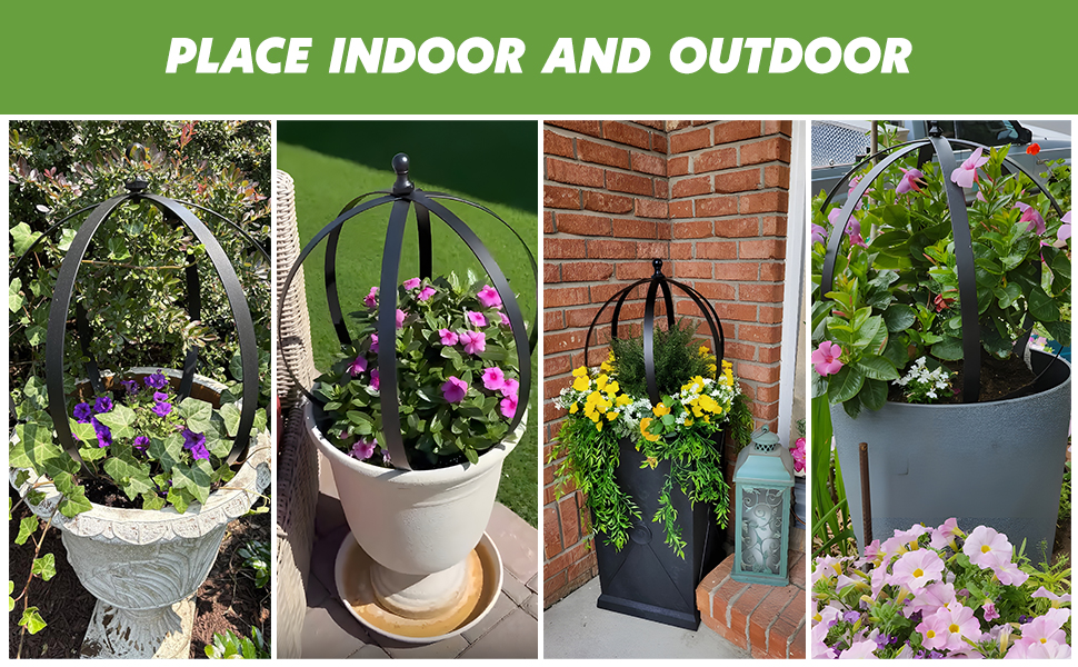 Large round black metal trellis for indoor/outdoor climbing plants. Powder-coated rust-proof finish, easy assembly. 18x22in decorative topiary frame perfect for potted plants & garden gifts.