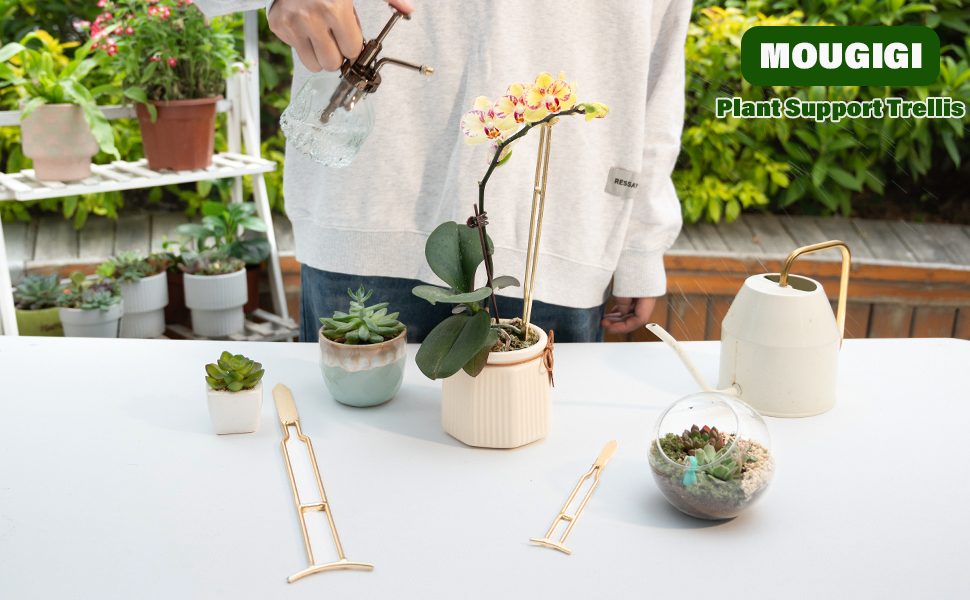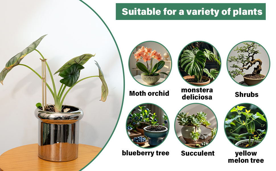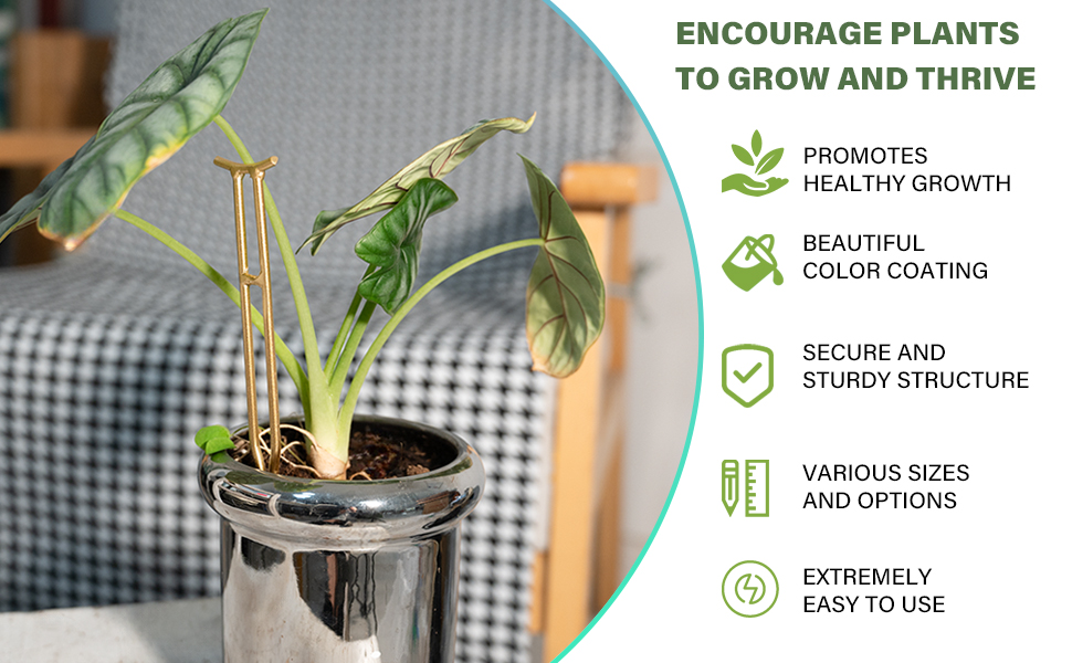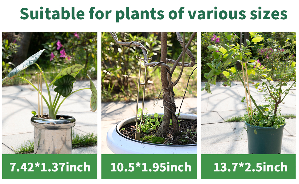 Gold metal plant stakes in 3 sizes (7.6"-14") for Monstera, Philodendron & climbing plants. Rust-resistant, easy to install indoors/outdoors. Elegant design promotes healthy upright growth.