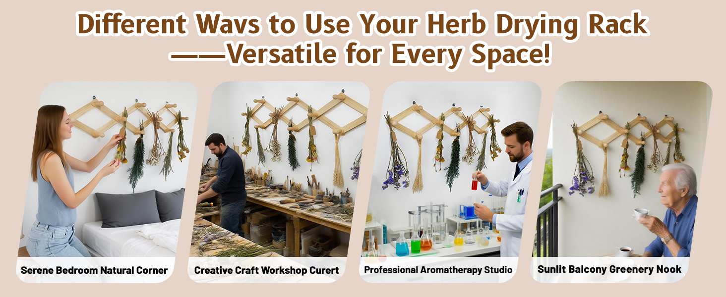Adjustable pine wood rack holds 10 herb bouquets. Includes adhesive hooks, jute ropes & gift labels. Natural air-drying preserves freshness. Multi-functional wall decor & unique gardening gift.