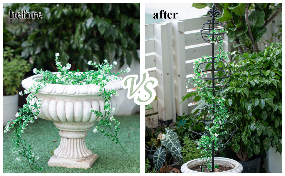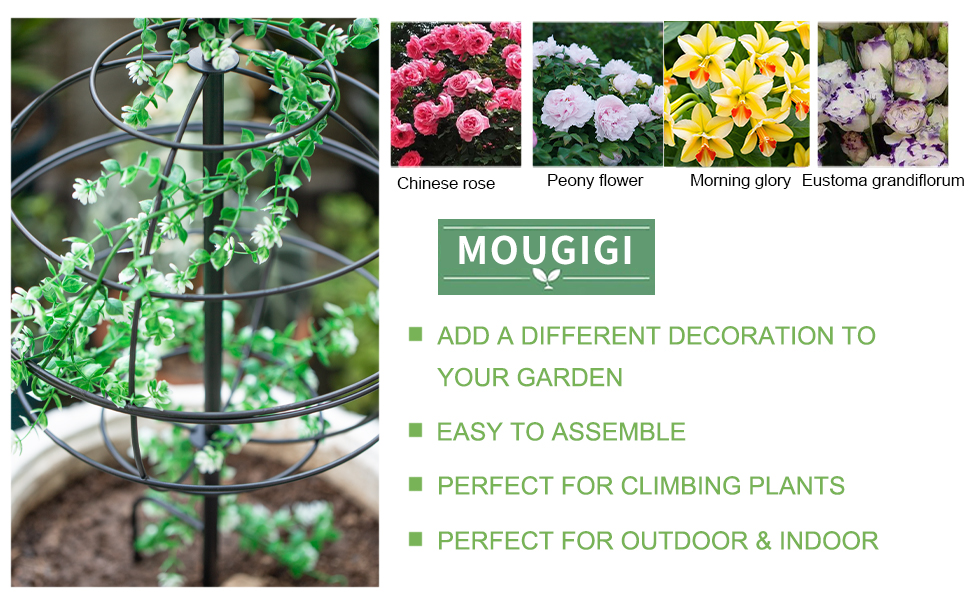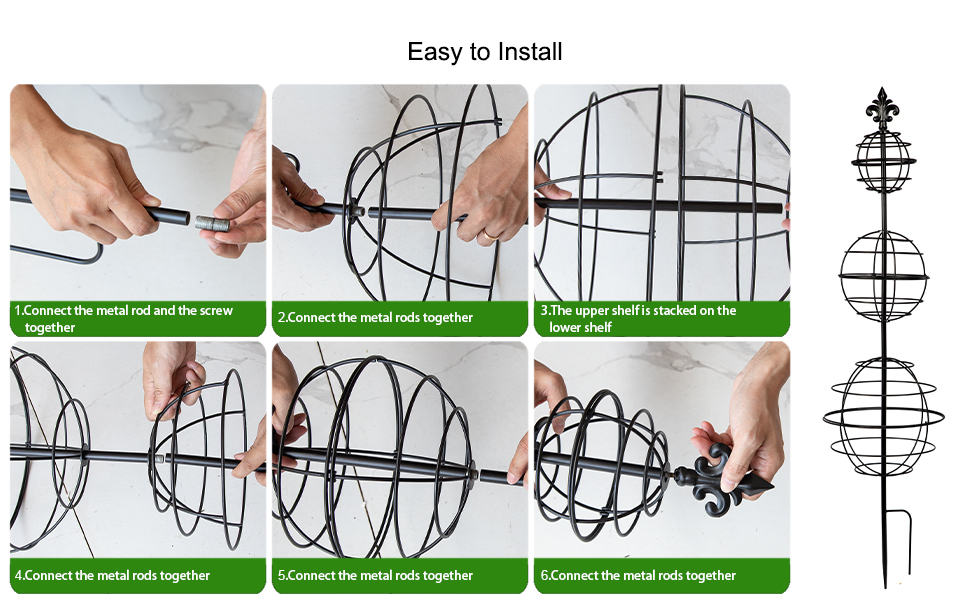 Elegant metal obelisk trellis with patented 3-tier sphere design. 49.5x12 inches, perfect for roses & vines.