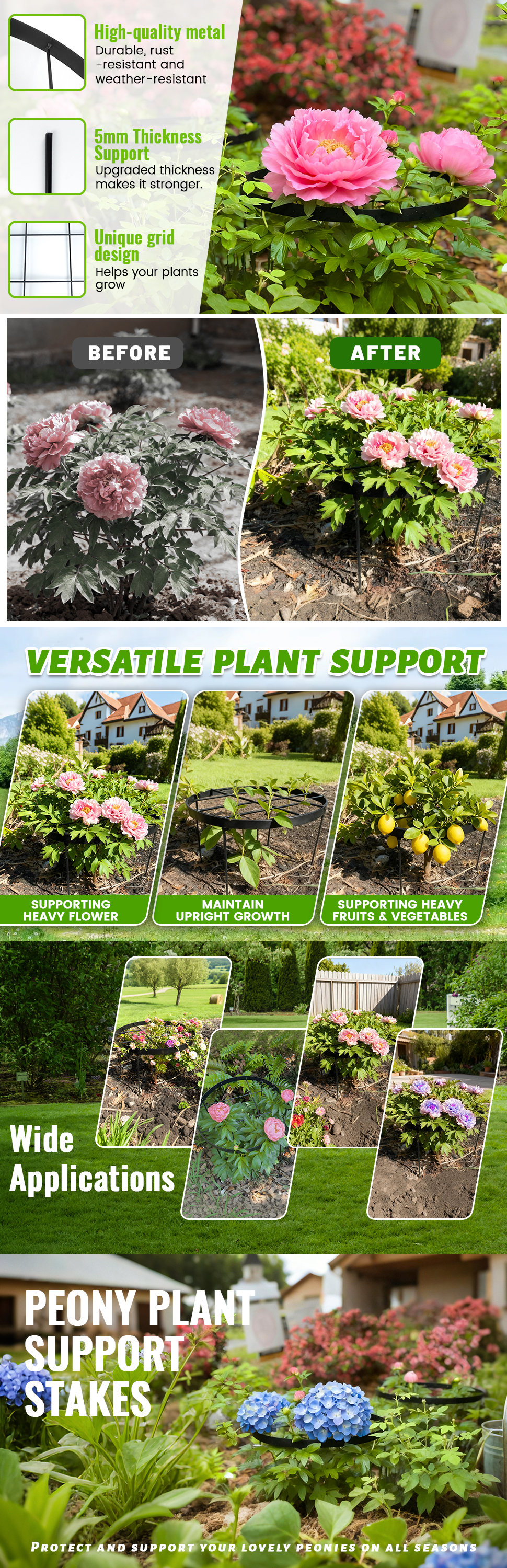 18.9-inch metal peony cage with 23.6-inch stakes provides sturdy support for heavy blooms. Rust-resistant wire construction, tool-free assembly. Ideal for peonies, dahlias & tall perennials.