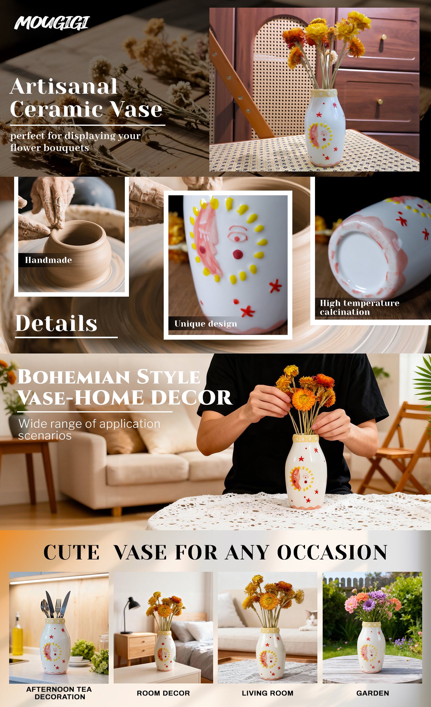 Sun & Moon Face Ceramic Vase - Boho Dried Flower Decor