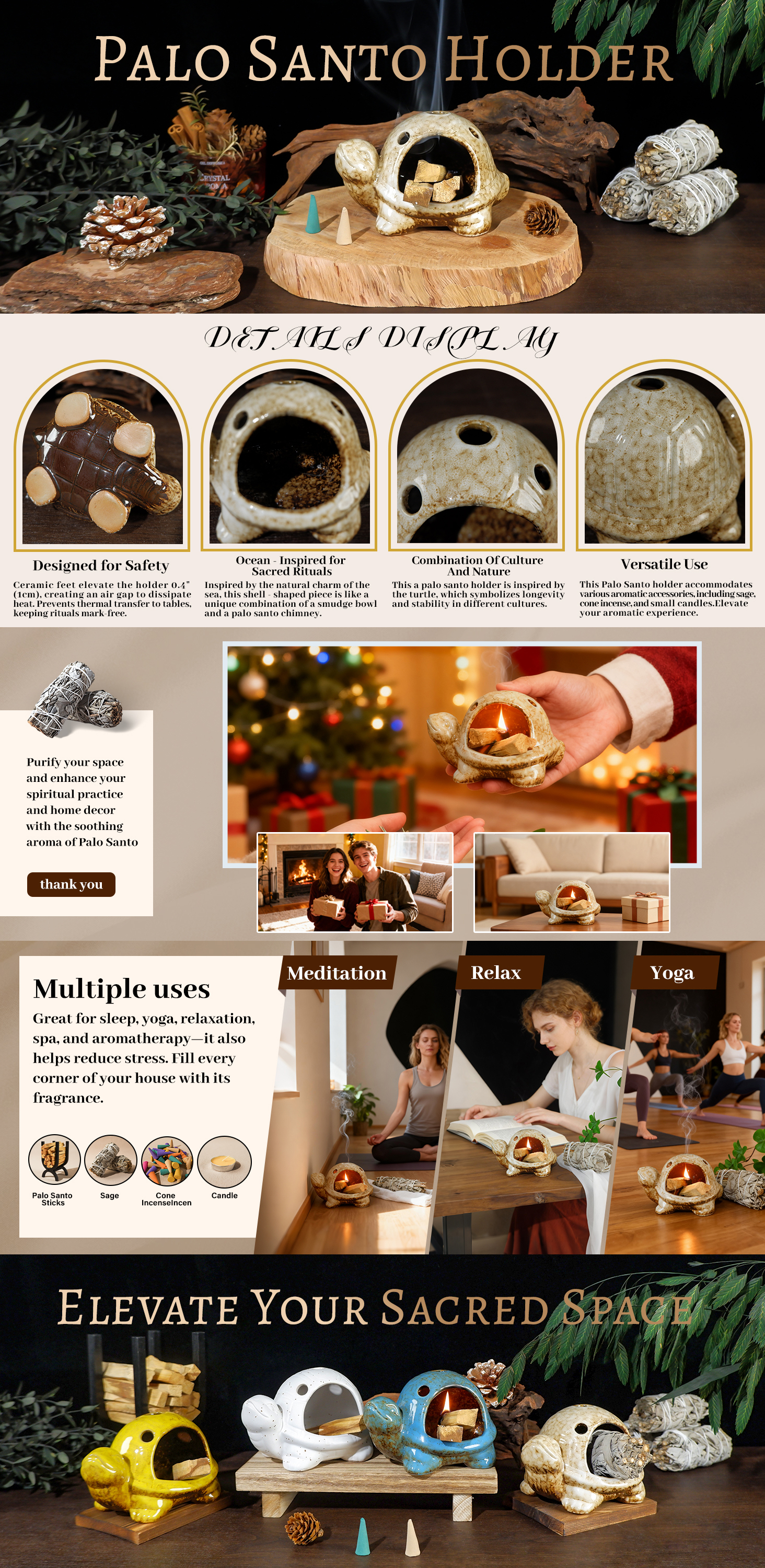 Handcrafted brown ceramic turtle incense burner for Palo Santo, sage & cones. 1200°C fired with ash catcher & heat-resistant feet. Creates serene atmosphere for meditation & yoga. Perfect zen gift.