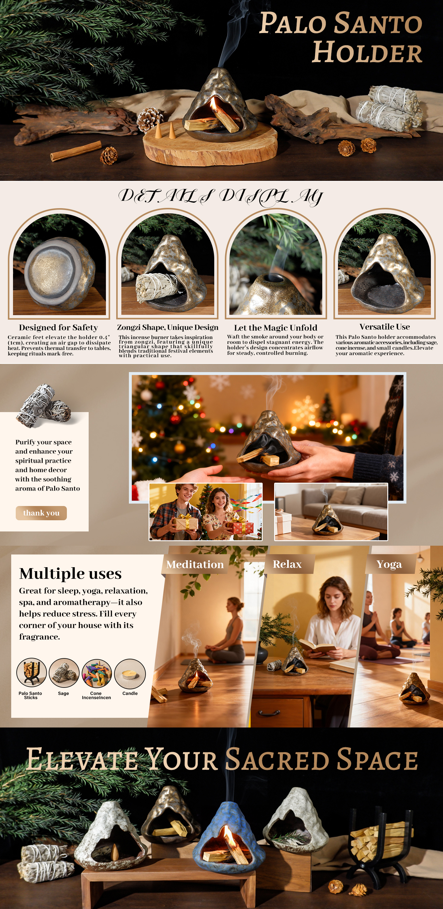 Handcrafted clay incense burner with zongzi chimney. 1200°C kiln-fired for heat resistance. Holds Palo Santo, sage & tealights. Perfect for meditation, yoga & zen decor.